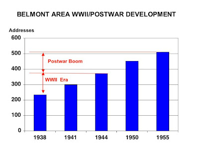 This chart pretty much tells the story; underdevelopment coming in from the 1920s/30s, with more of a postwar construction boom here compared to the Belmont example, particularly in the early 1950s.